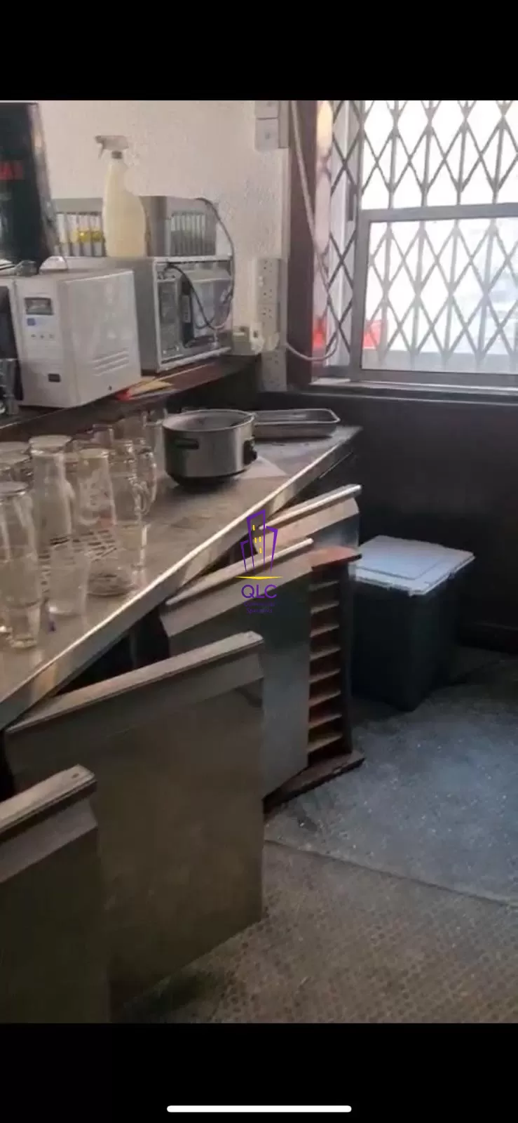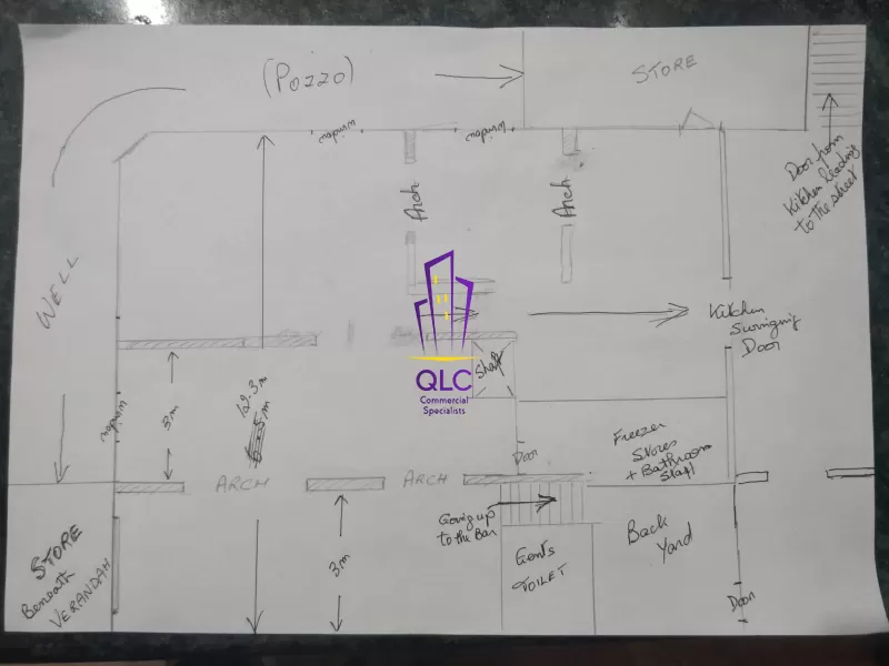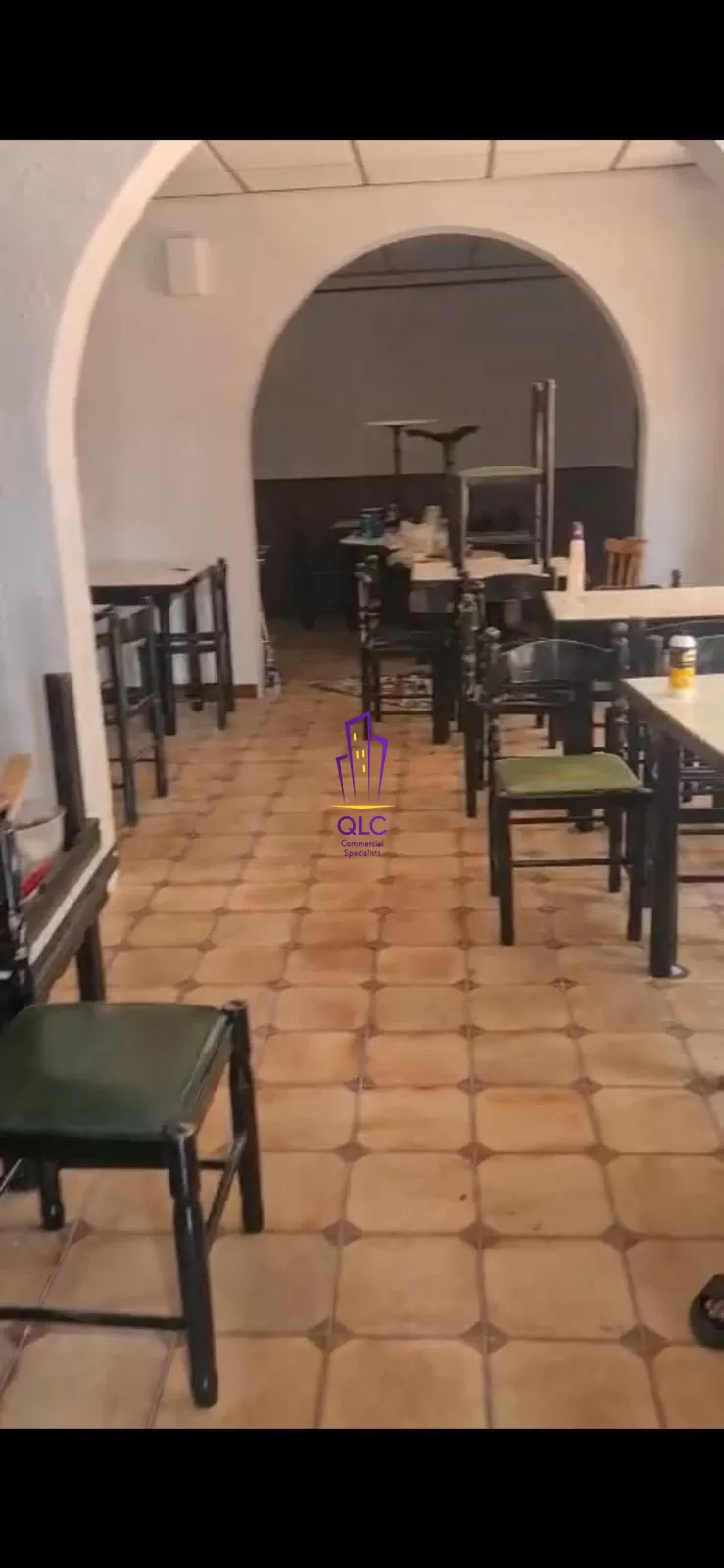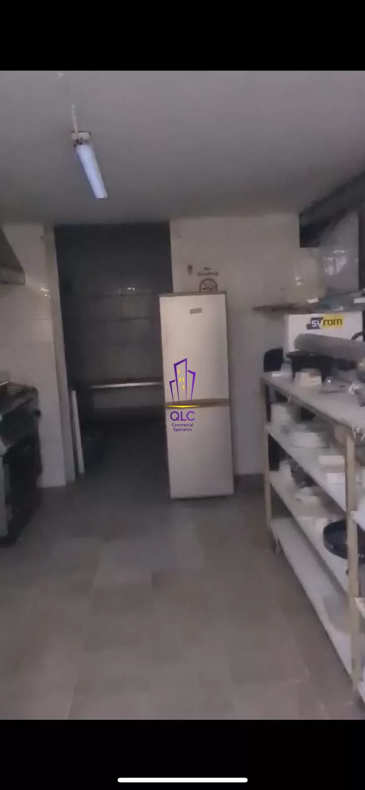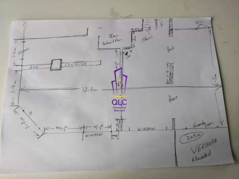 The property includes a fully equipped kitchen and several back-of-house rooms such as storage areas and staff restrooms, allowing for efficient workflow and clear separation between service and customer areas. It is licensed for operation as a bar and restaurant and equipped with standard catering infrastructure, including air-conditioning units, bar fittings, kitchen appliances, and refrigeration.
